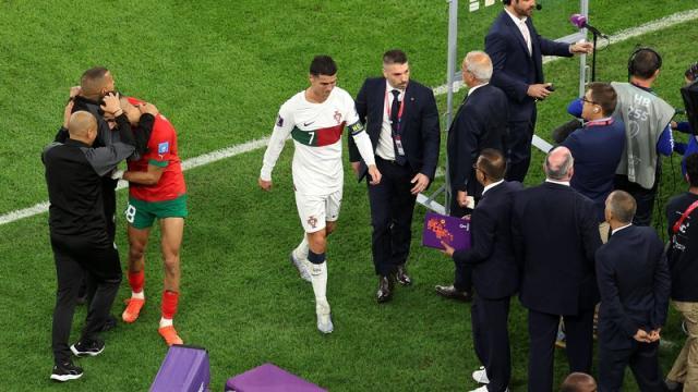 但最终的剧本走了悲情的路子:第51分钟顶替贡萨洛·拉莫斯替补上场时,葡萄牙队0比1落后,陷入摩洛哥人的铁桶阵,C罗也无力回天,个人第5届世界杯,最后一届世界杯,就这样提前结束了,主裁判终场哨响,C罗哭了。